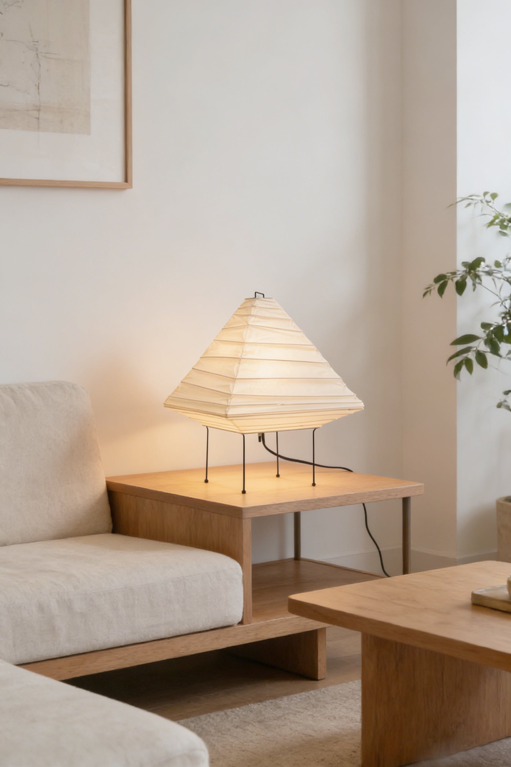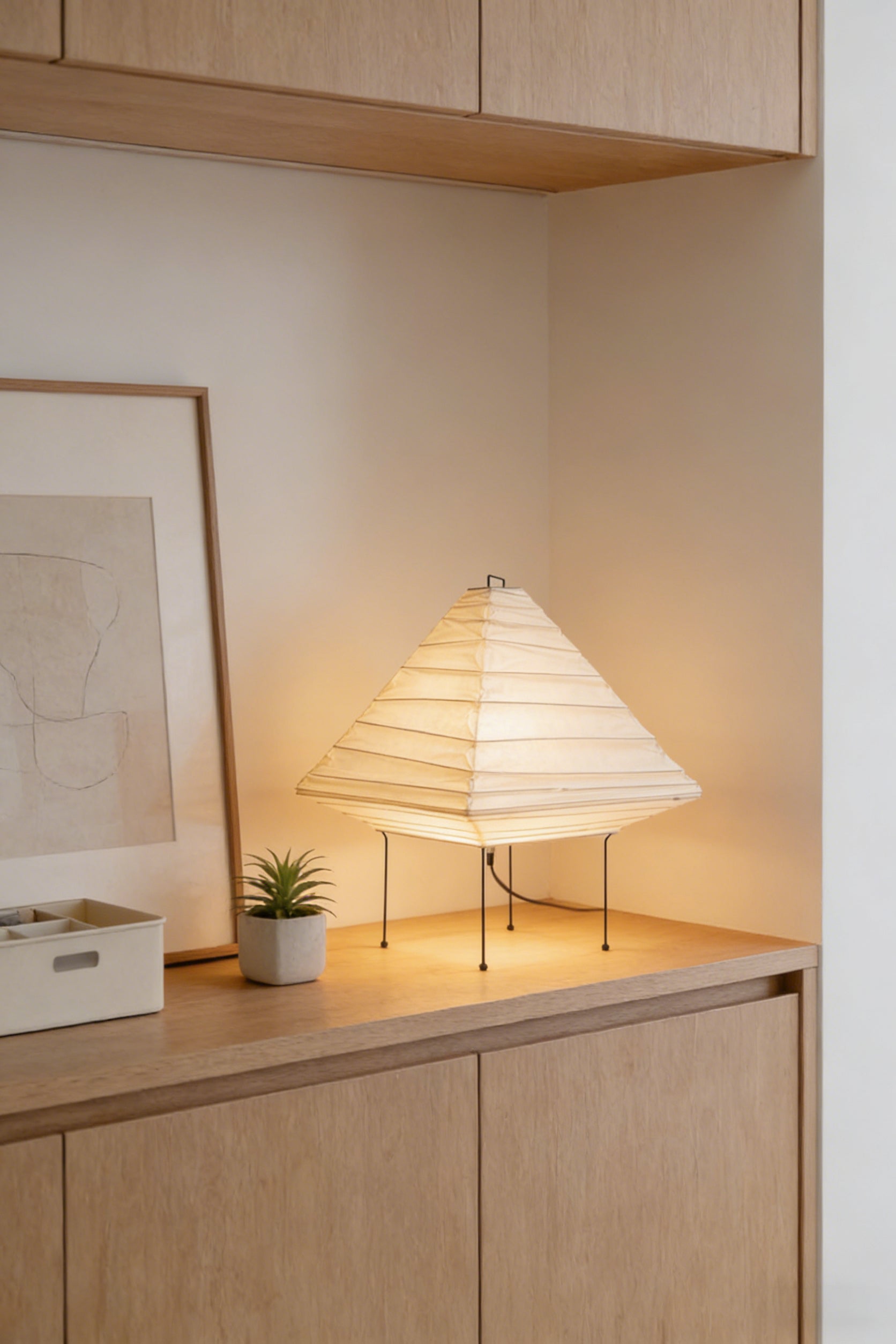 A statement of balance and form. The Akari 5X features a striking pyramid-inspired design with clean, architectural pleats. Its bold geometric shape transforms from a modern art object by day into a glowing, weightless sculpture by night, adding a sophisticated focal point to any room.