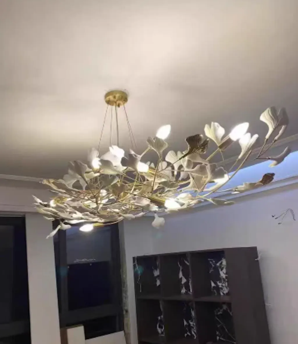 The texture on the gingko leaves is really detailed. It doesn't just look like flat metal; it has a real organic feel to it. It’s definitely a high-quality brass chandelier.