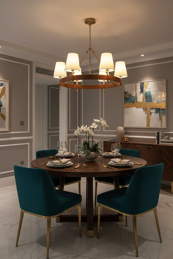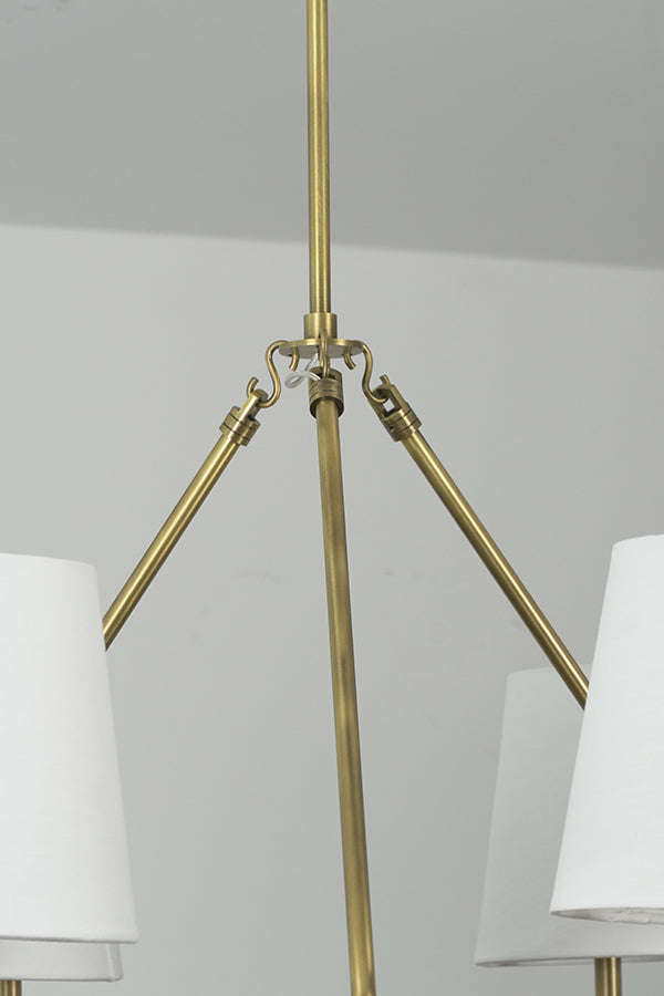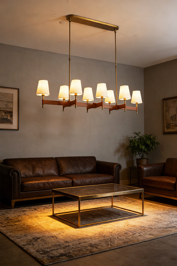 Crafted with premium metal, refined leather accents, and softly diffused fabric shades, this chandelier balances elegance with durability. Though light in appearance, its structure is solid and reliable. Each piece is carefully inspected to ensure warm, even illumination and long-lasting performance, creating a timeless statement for any space.