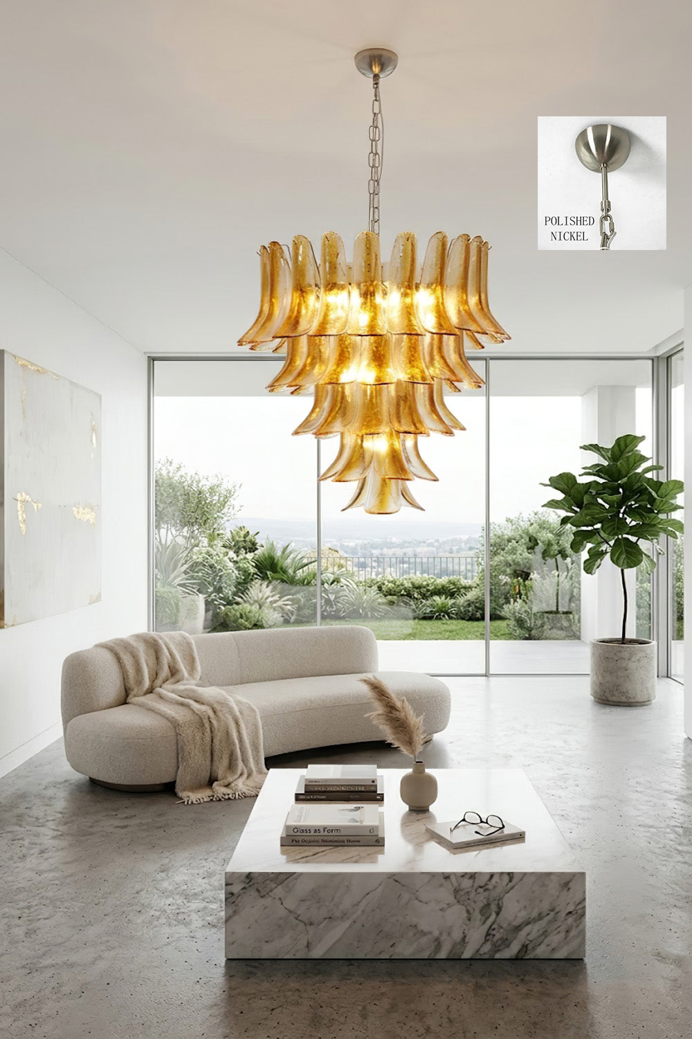 Distinct tiers of amber glass petals create a uniquely exclusive and artistic focal point for your room.
