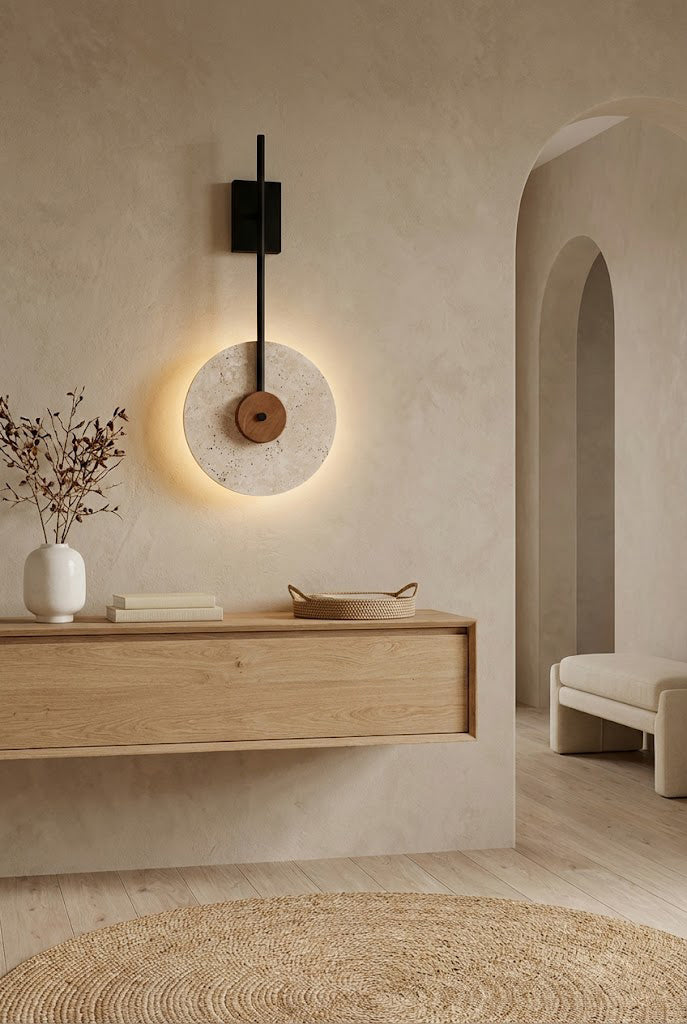 The Travertine Halo Wall Sconce features a clean circular form crafted from natural travertine, bringing a subtle architectural accent to walls in hallways, bedrooms, or beside mirrors. The stone’s organic texture and gentle tonal variations add depth and warmth, allowing the piece to enhance the space through material character and calm presence rather than visual ornament.